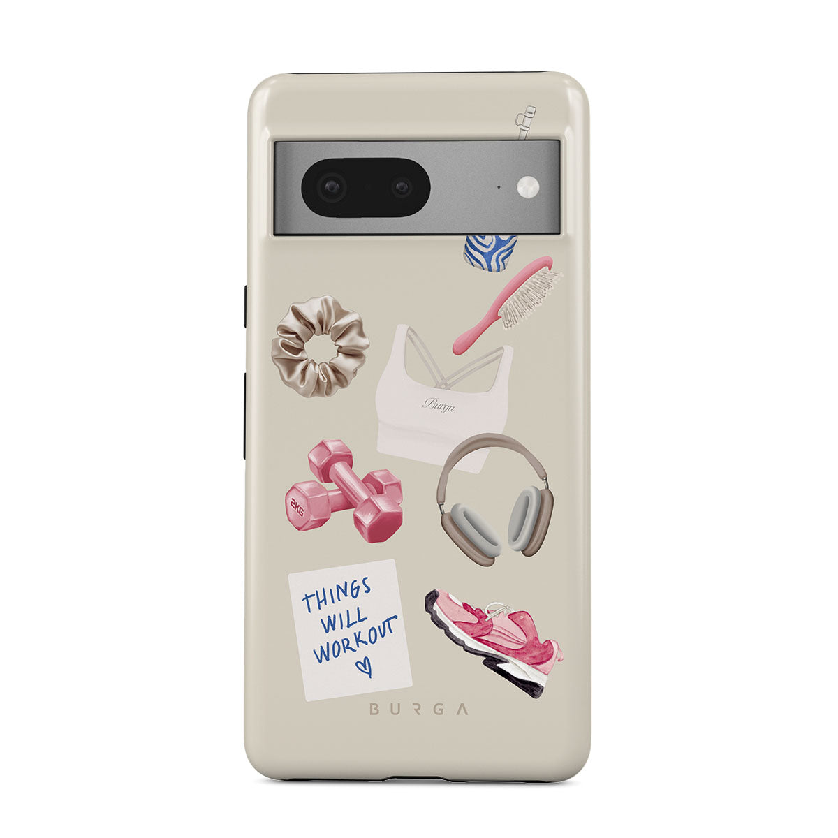 Den här stilen har: hantlar, hörlurar, vattenflaska, hårborste, rosa träningsskor, sport-bh, Crunchie-bar, post-it "Things Will Work Out".