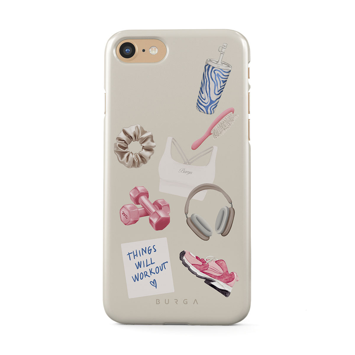 Den här stilen har: hantlar, hörlurar, vattenflaska, hårborste, rosa träningsskor, sport-bh, Crunchie-bar, post-it "Things Will Work Out".