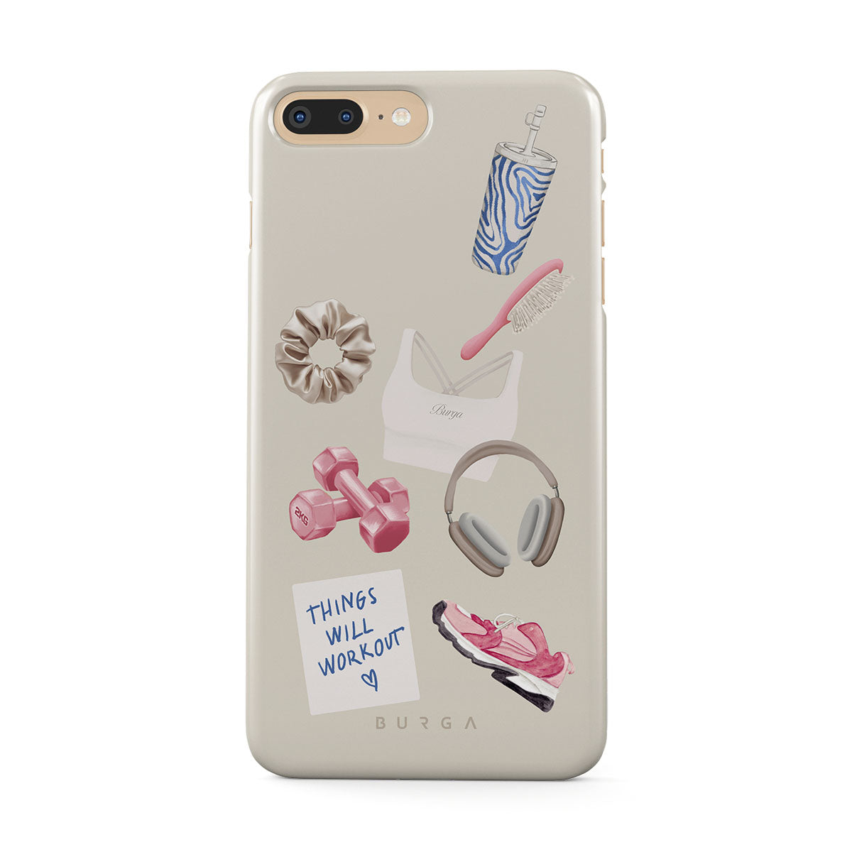 Den här stilen har: hantlar, hörlurar, vattenflaska, hårborste, rosa träningsskor, sport-bh, Crunchie-bar, post-it "Things Will Work Out".