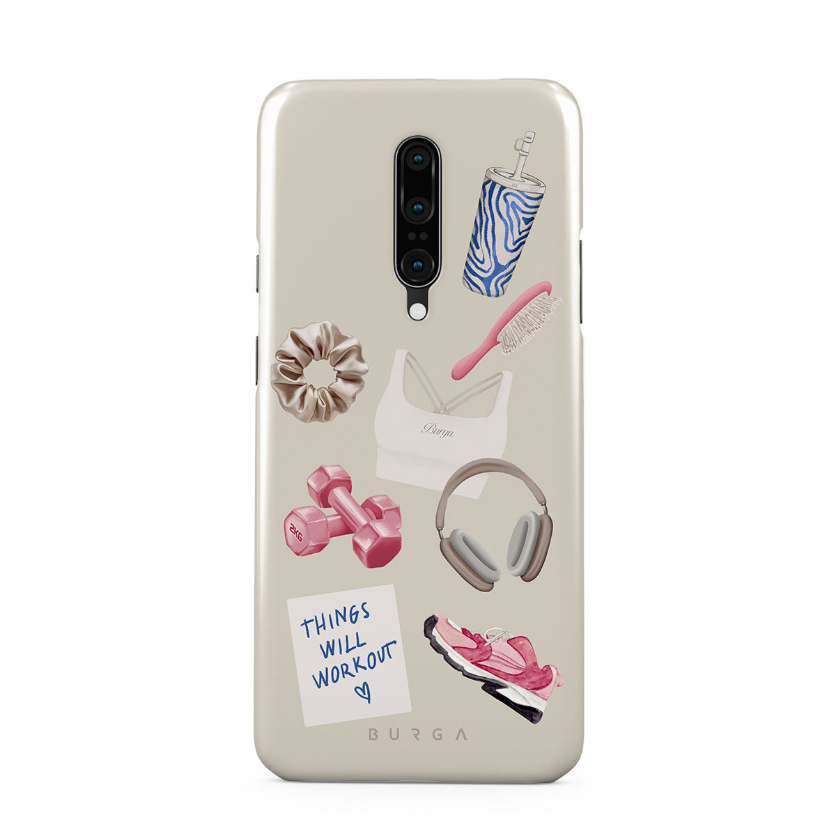 Den här stilen har: hantlar, hörlurar, vattenflaska, hårborste, rosa träningsskor, sport-bh, Crunchie-bar, post-it "Things Will Work Out".