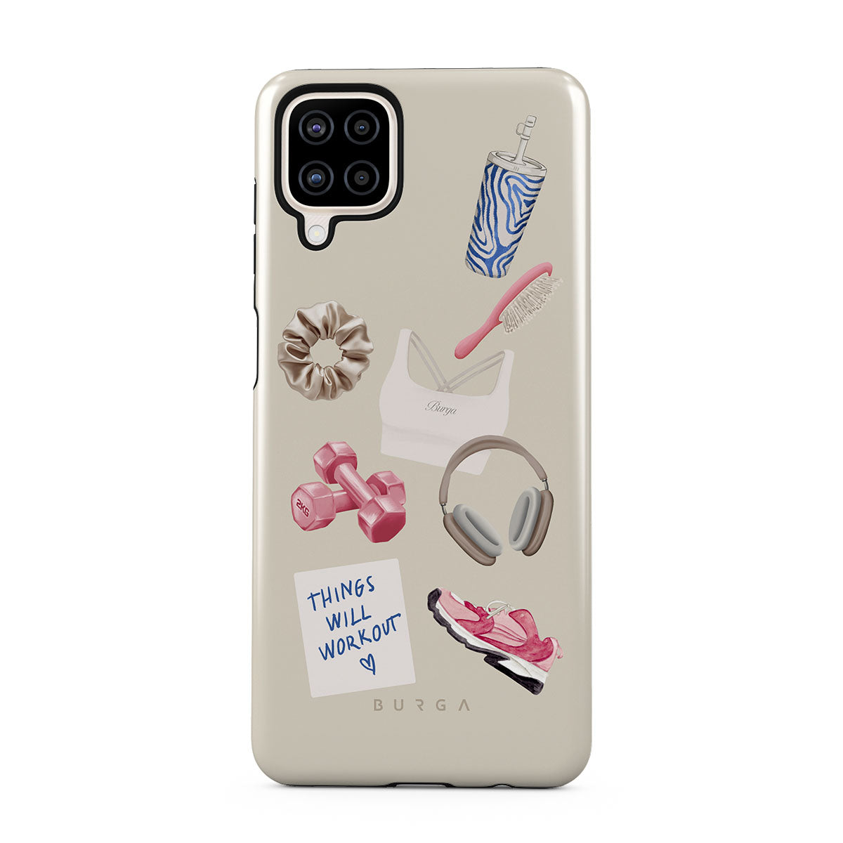 Den här stilen har: hantlar, hörlurar, vattenflaska, hårborste, rosa träningsskor, sport-bh, Crunchie-bar, post-it "Things Will Work Out".