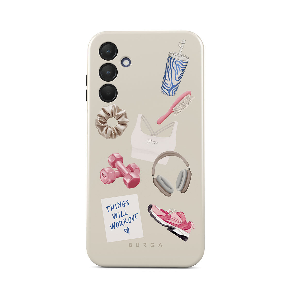 Den här stilen har: hantlar, hörlurar, vattenflaska, hårborste, rosa träningsskor, sport-bh, Crunchie-bar, post-it "Things Will Work Out".