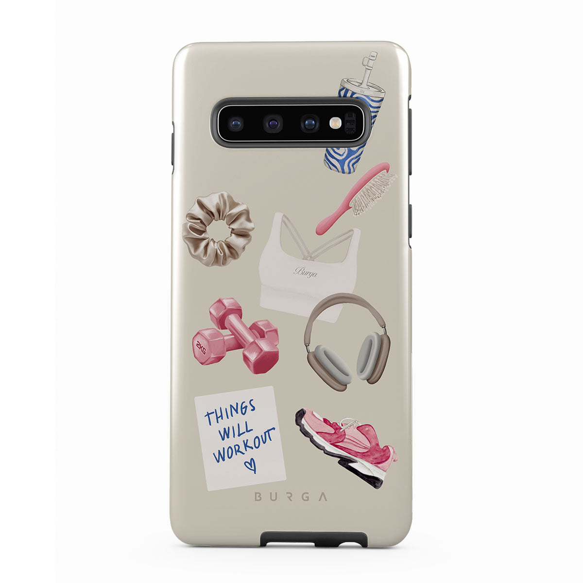 Den här stilen har: hantlar, hörlurar, vattenflaska, hårborste, rosa träningsskor, sport-bh, Crunchie-bar, post-it "Things Will Work Out".