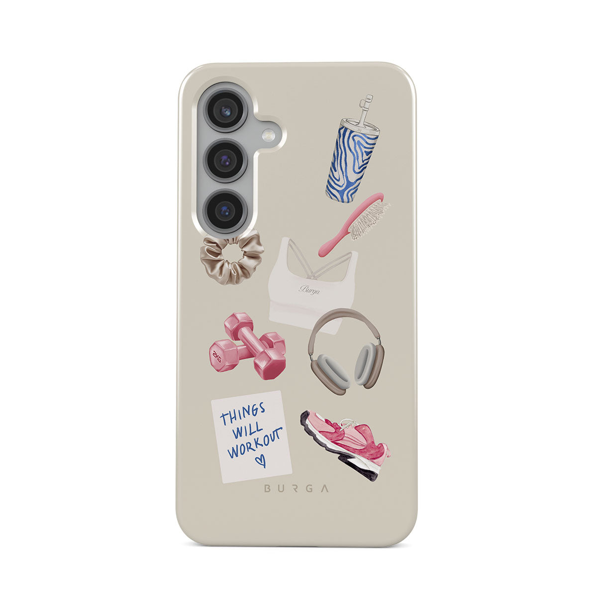 Den här stilen har: hantlar, hörlurar, vattenflaska, hårborste, rosa träningsskor, sport-bh, Crunchie-bar, post-it "Things Will Work Out".