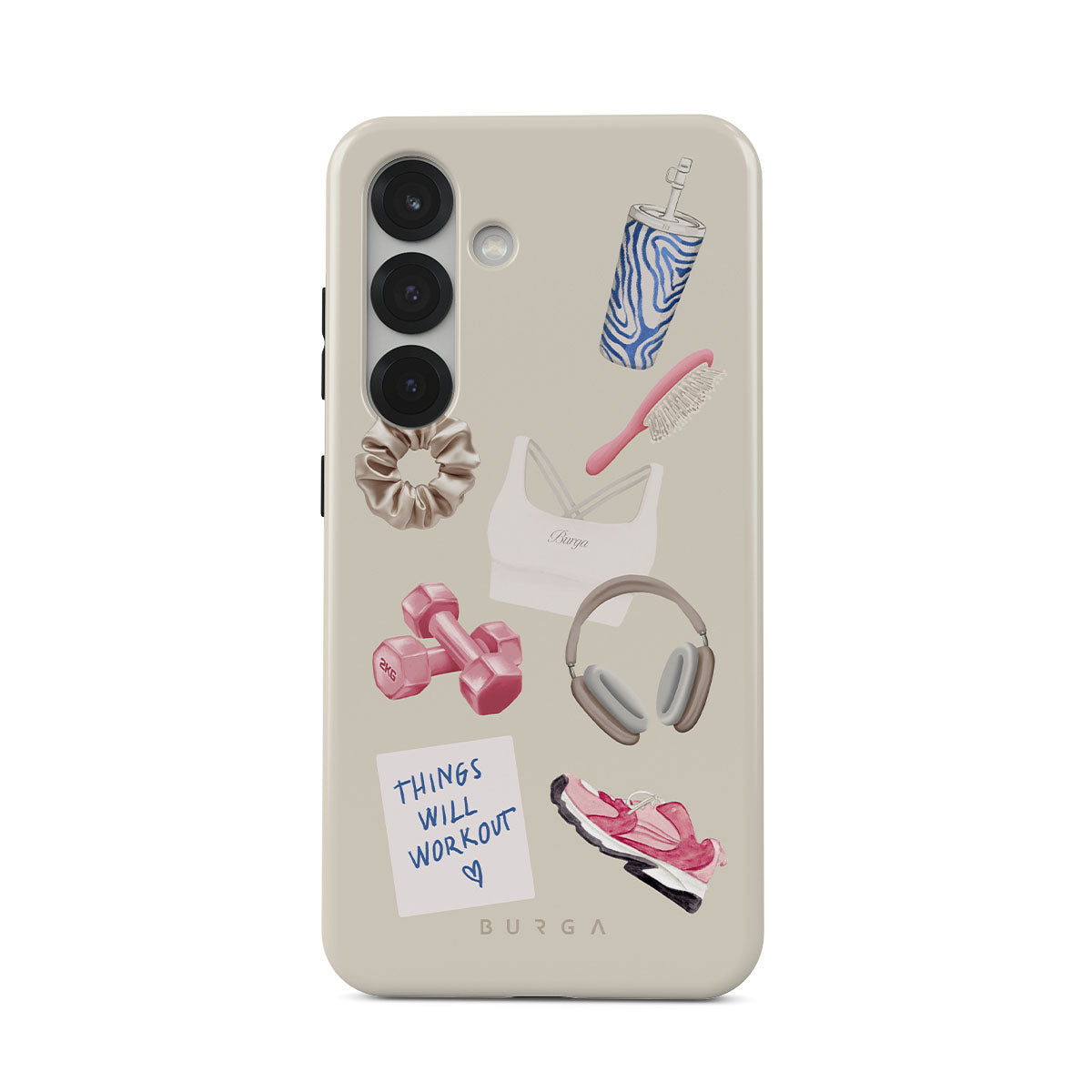 Den här stilen har: hantlar, hörlurar, vattenflaska, hårborste, rosa träningsskor, sport-bh, Crunchie-bar, post-it "Things Will Work Out".