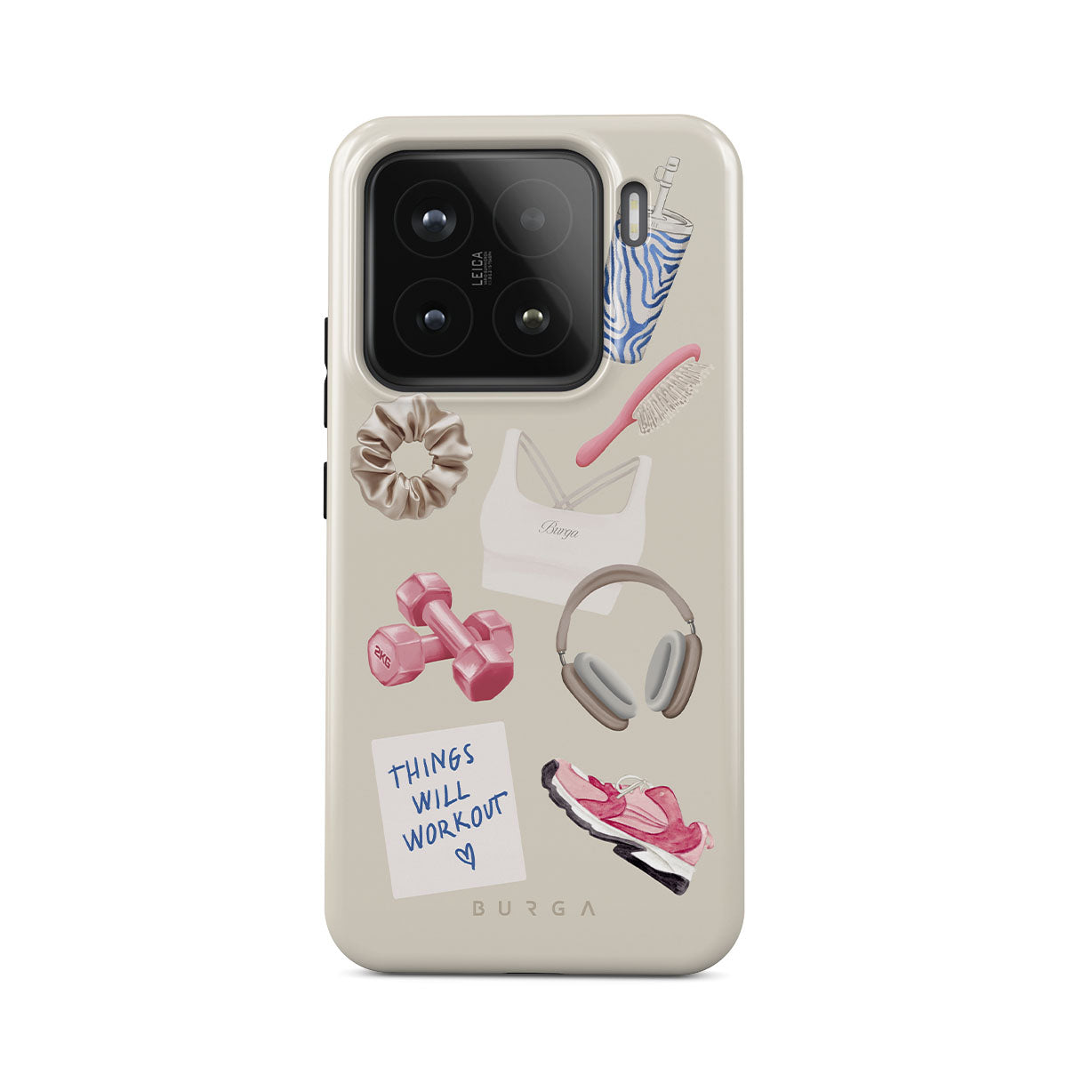 Den här stilen har: hantlar, hörlurar, vattenflaska, hårborste, rosa träningsskor, sport-bh, Crunchie-bar, post-it "Things Will Work Out".