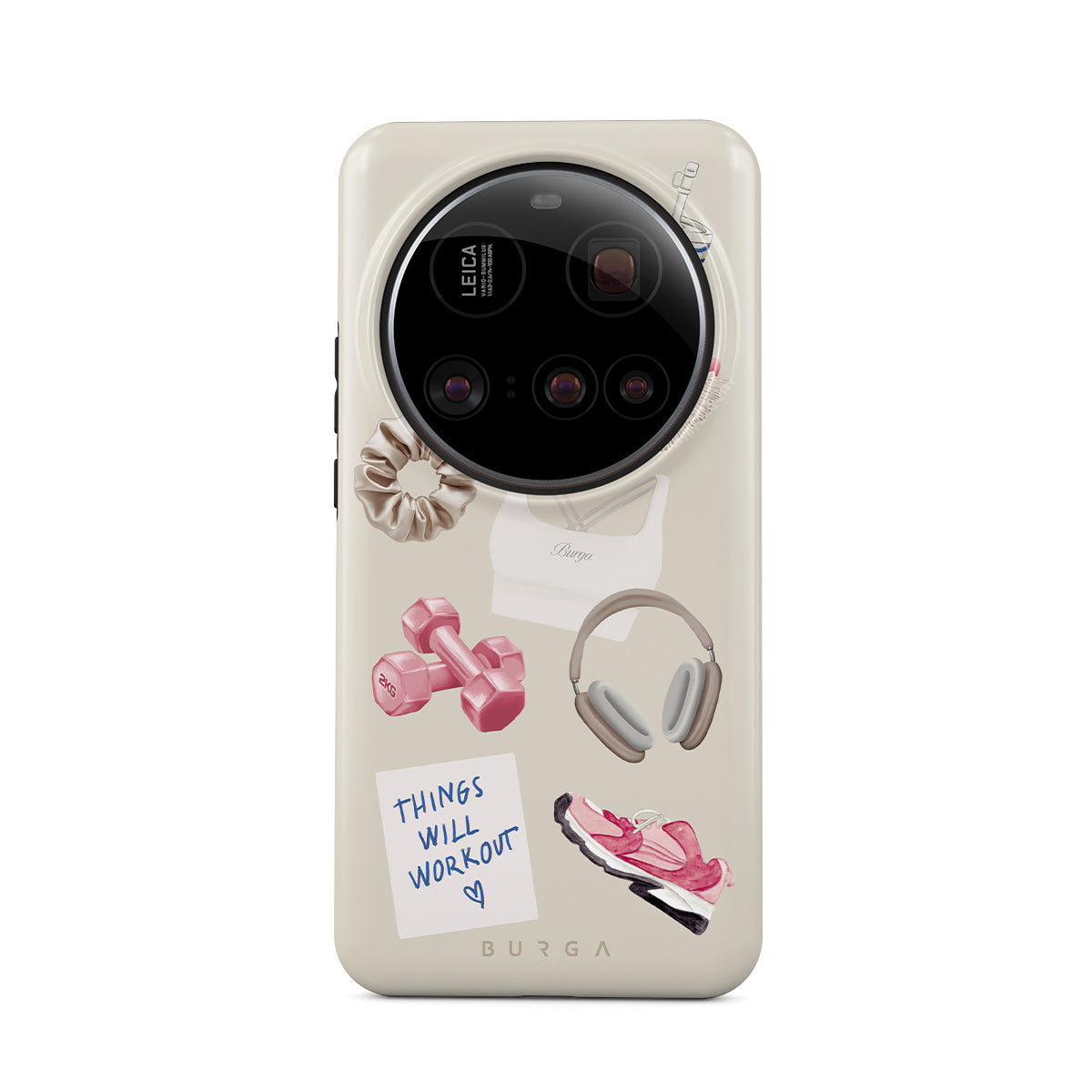 Den här stilen har: hantlar, hörlurar, vattenflaska, hårborste, rosa träningsskor, sport-bh, Crunchie-bar, post-it "Things Will Work Out".