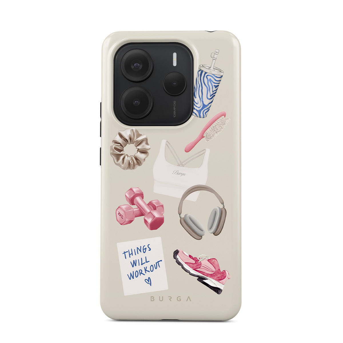 Den här stilen har: hantlar, hörlurar, vattenflaska, hårborste, rosa träningsskor, sport-bh, Crunchie-bar, post-it "Things Will Work Out".