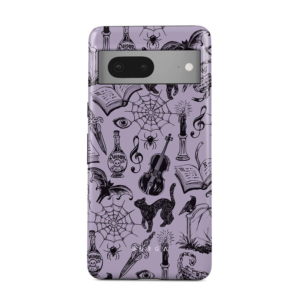 Denna design har: gotiska klotter, mystiska element, spindlar, spindelnät, katt, violin, öga, ljus, dolk, bok, fladdermus, korp, skorpion