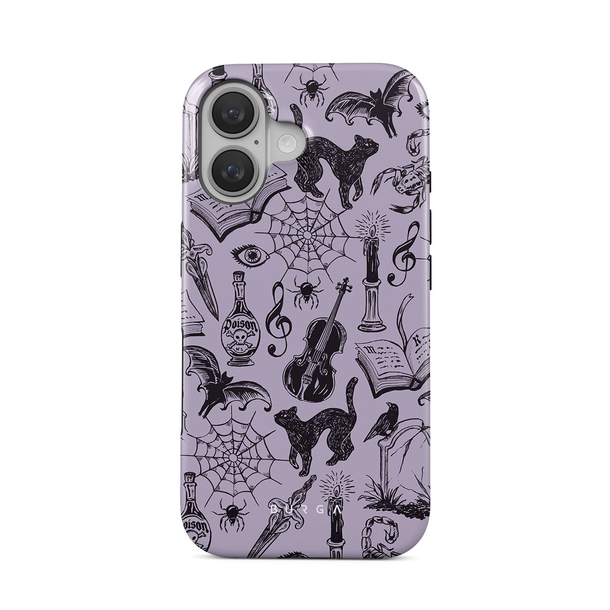 Denna design har: gotiska klotter, mystiska element, spindlar, spindelnät, katt, violin, öga, ljus, dolk, bok, fladdermus, korp, skorpion