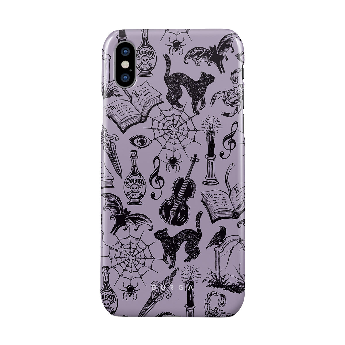 Denna design har: gotiska klotter, mystiska element, spindlar, spindelnät, katt, violin, öga, ljus, dolk, bok, fladdermus, korp, skorpion