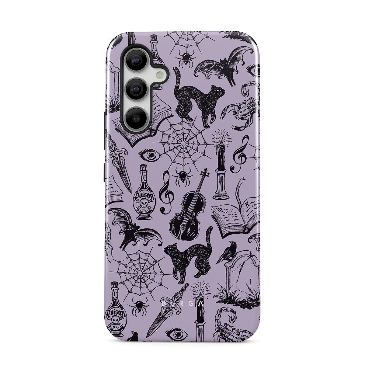 Denna design har: gotiska klotter, mystiska element, spindlar, spindelnät, katt, violin, öga, ljus, dolk, bok, fladdermus, korp, skorpion