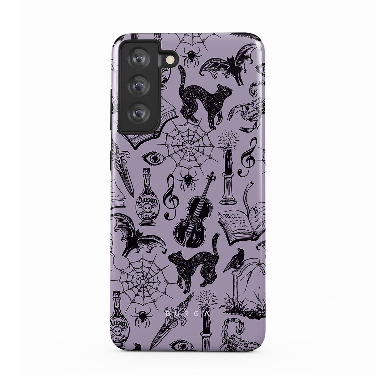 Denna design har: gotiska klotter, mystiska element, spindlar, spindelnät, katt, violin, öga, ljus, dolk, bok, fladdermus, korp, skorpion