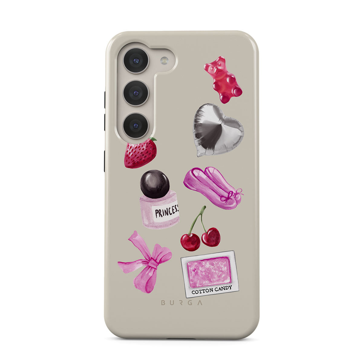 Den här stilen har: rosa rosett, silverfärgad hjärtformad ballong, parfymflaska, jordgubbe, körsbär, rosa balettskor, sockervadd-klistermärke, rosa gummibjörn.