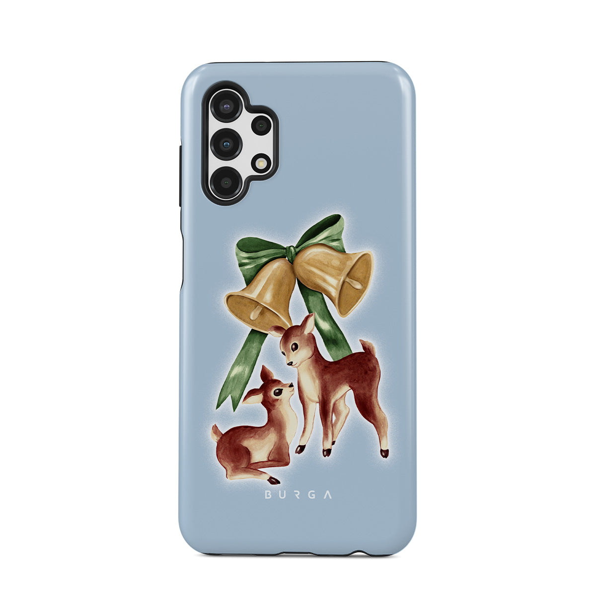 Denna design har: vintage ren, julklockor, gyllene klockor, retro renillustration, babyhjort, ljusblå bakgrund