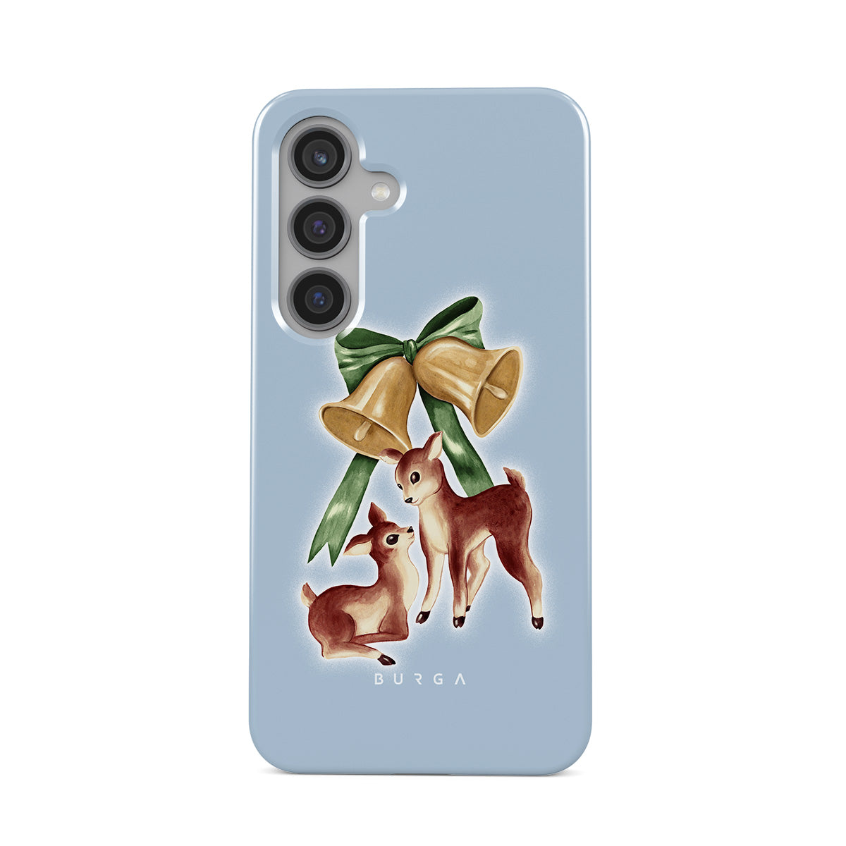 Denna design har: vintage ren, julklockor, gyllene klockor, retro renillustration, babyhjort, ljusblå bakgrund