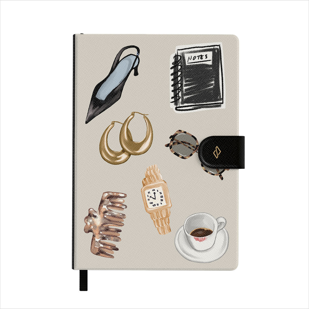 Den här stilen har: svart högklackad sko, guldringar, svart anteckningsbok, kaffekopp, sköldpaddsmönstrade glasögon, brun scrunchie, retro guldur.