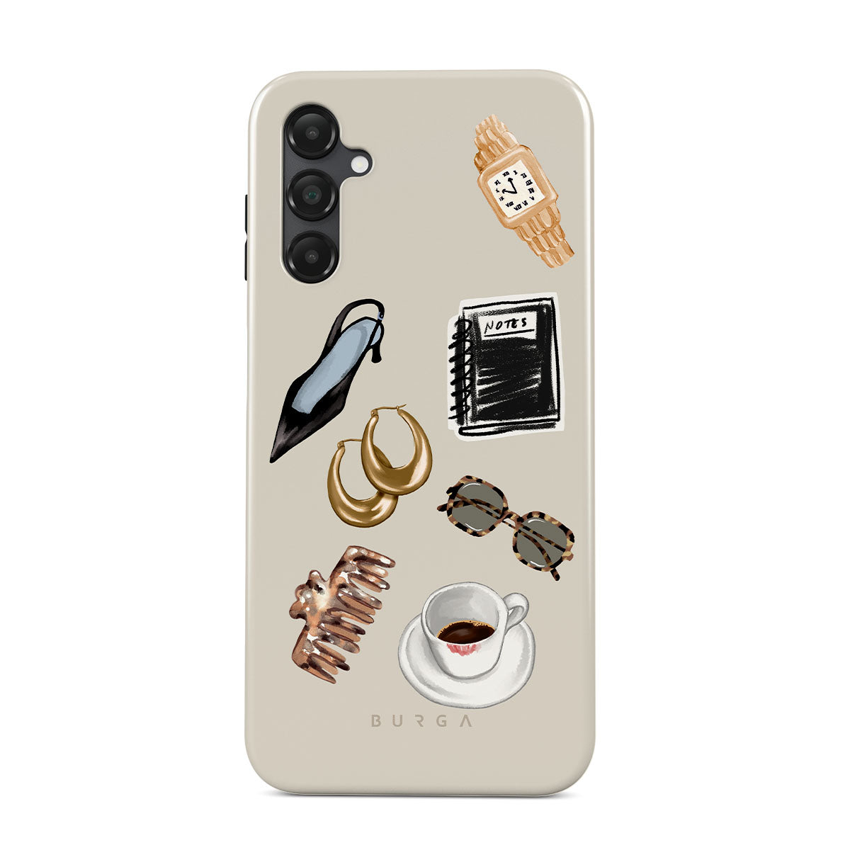 Den här stilen har: svart högklackad sko, guldringar, svart anteckningsbok, kaffekopp, sköldpaddsmönstrade glasögon, brun scrunchie, retro guldur.
