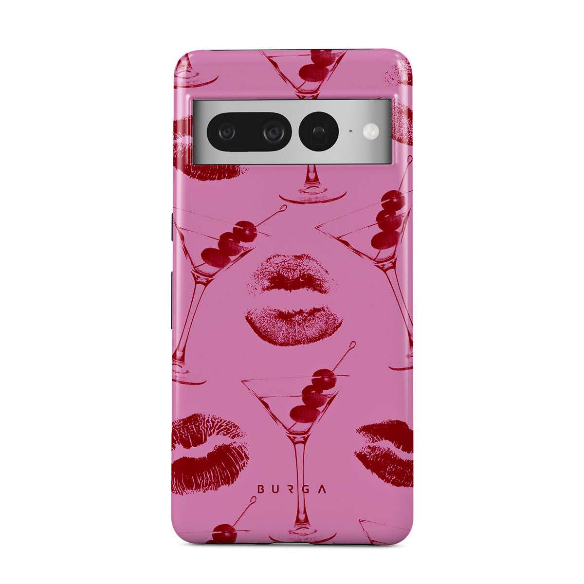 Denna design har: röda läppar, kyssar, cocktailglas, martinis.