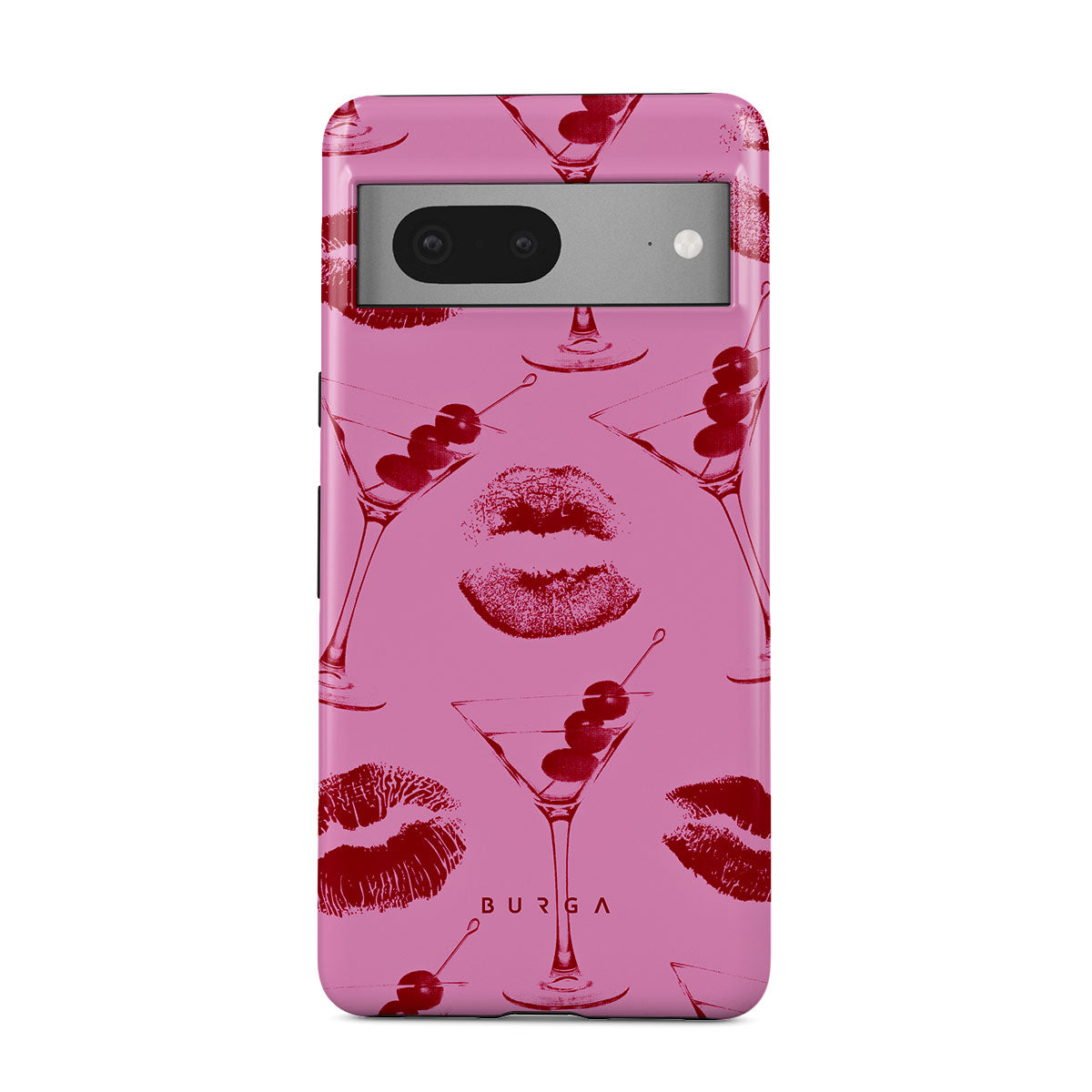 Denna design har: röda läppar, kyssar, cocktailglas, martinis.