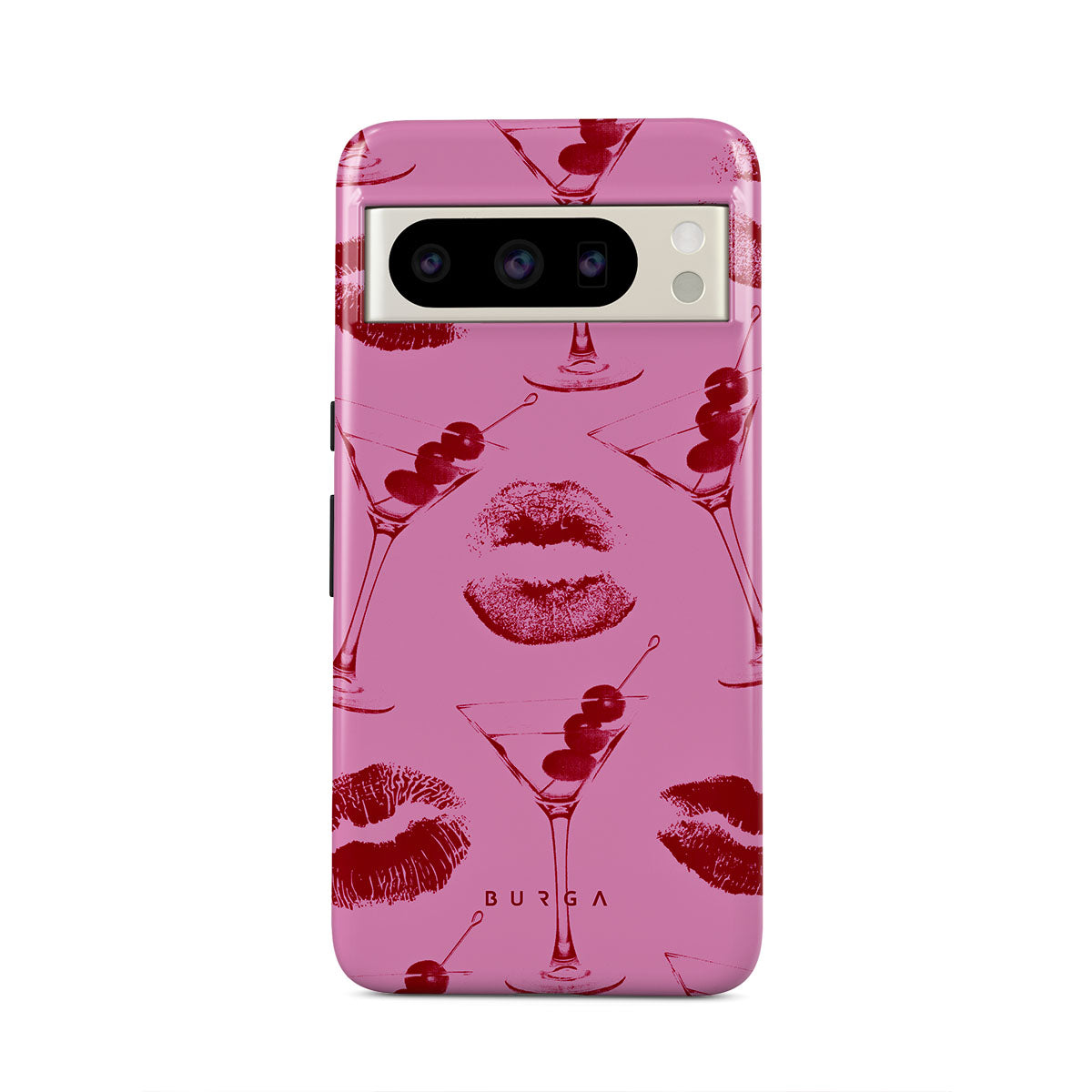 Denna design har: röda läppar, kyssar, cocktailglas, martinis.