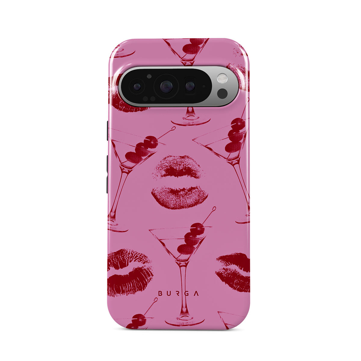 Denna design har: röda läppar, kyssar, cocktailglas, martinis.
