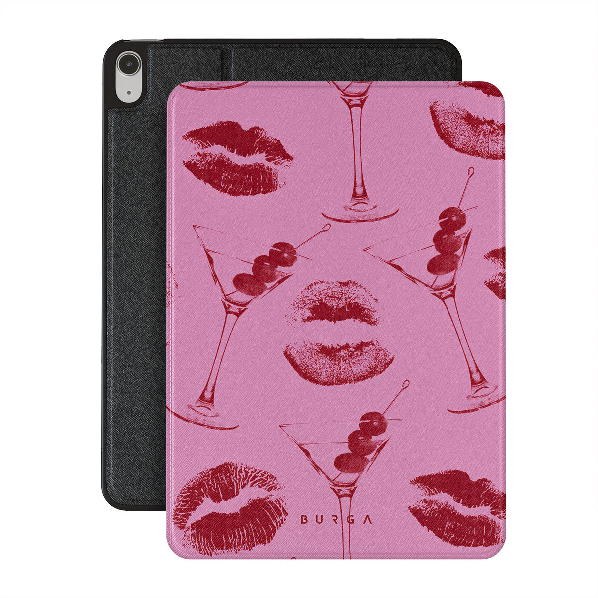 Denna design har: röda läppar, kyssar, cocktailglas, martinis.