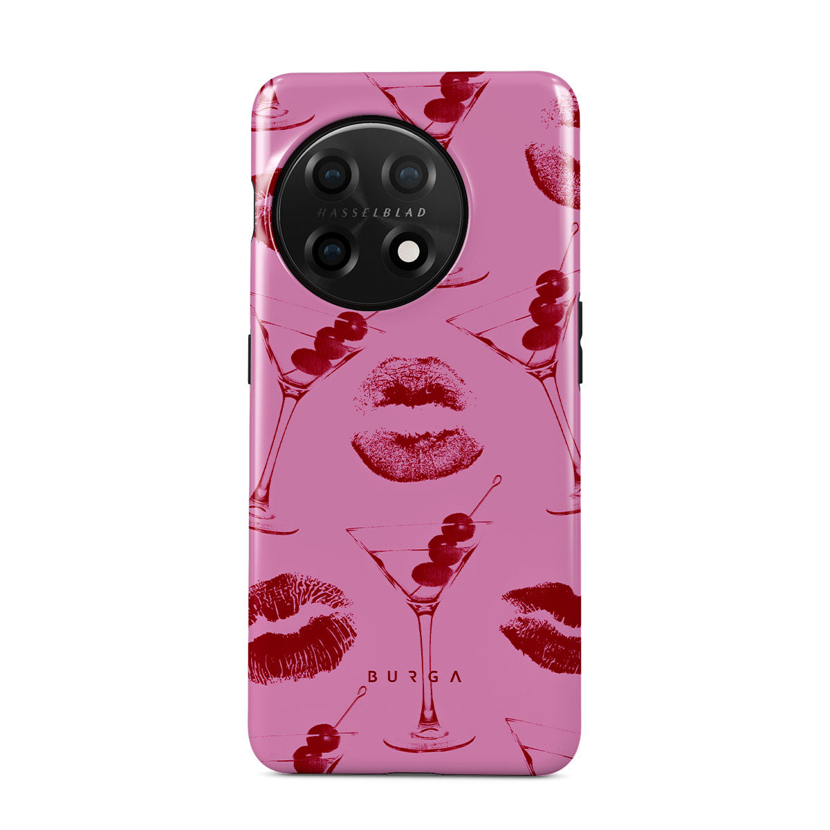Denna design har: röda läppar, kyssar, cocktailglas, martinis.
