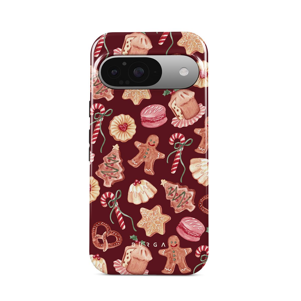 Denna design har: julsockor, pepparkaksmän, godisstänger, pepparmintgodis, festliga sötsaker, burgunderbakgrund