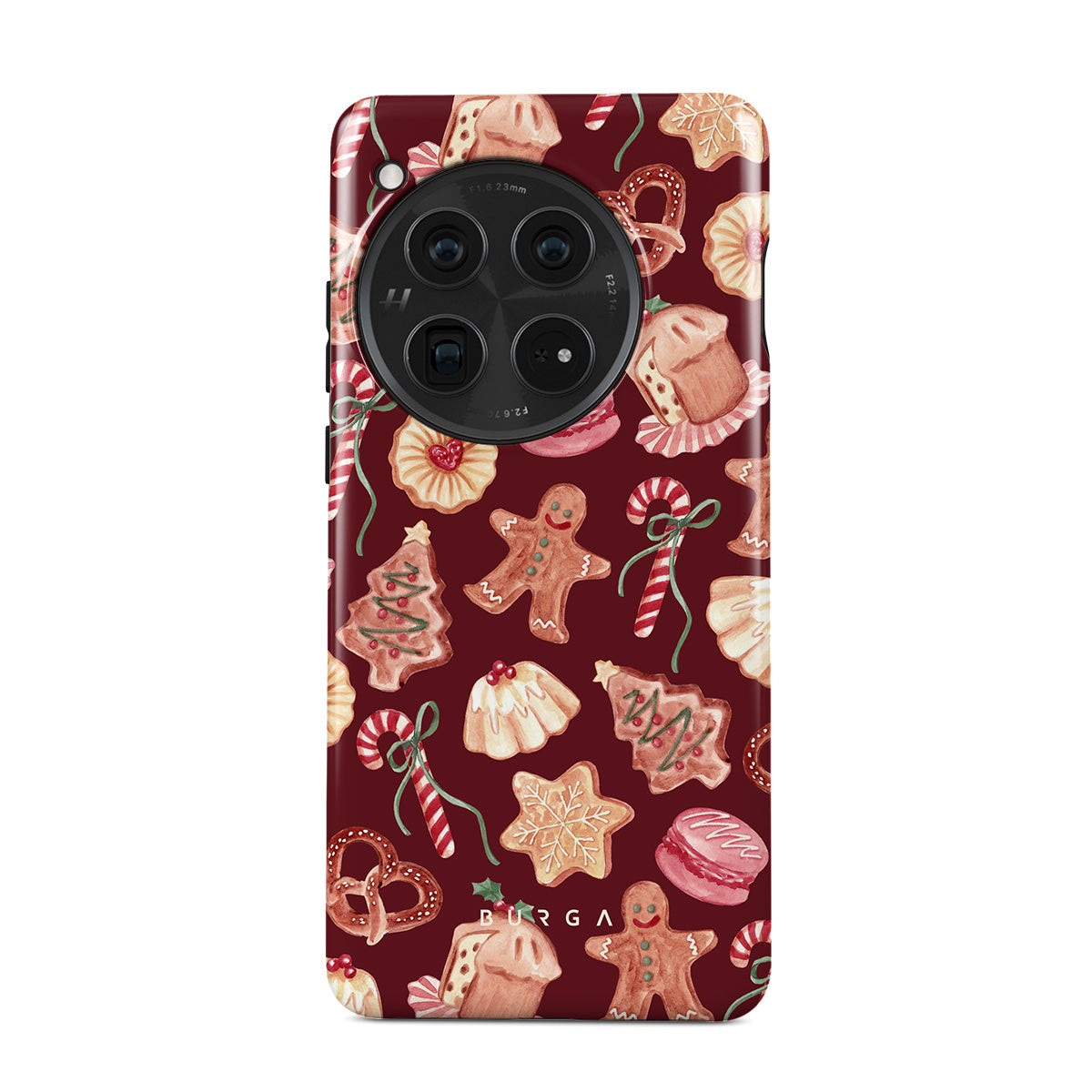 Denna design har: julsockor, pepparkaksmän, godisstänger, pepparmintgodis, festliga sötsaker, burgunderbakgrund