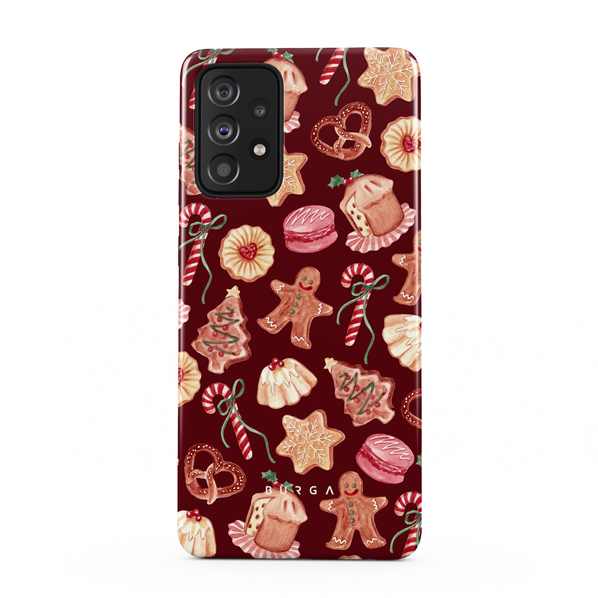 Denna design har: julsockor, pepparkaksmän, godisstänger, pepparmintgodis, festliga sötsaker, burgunderbakgrund