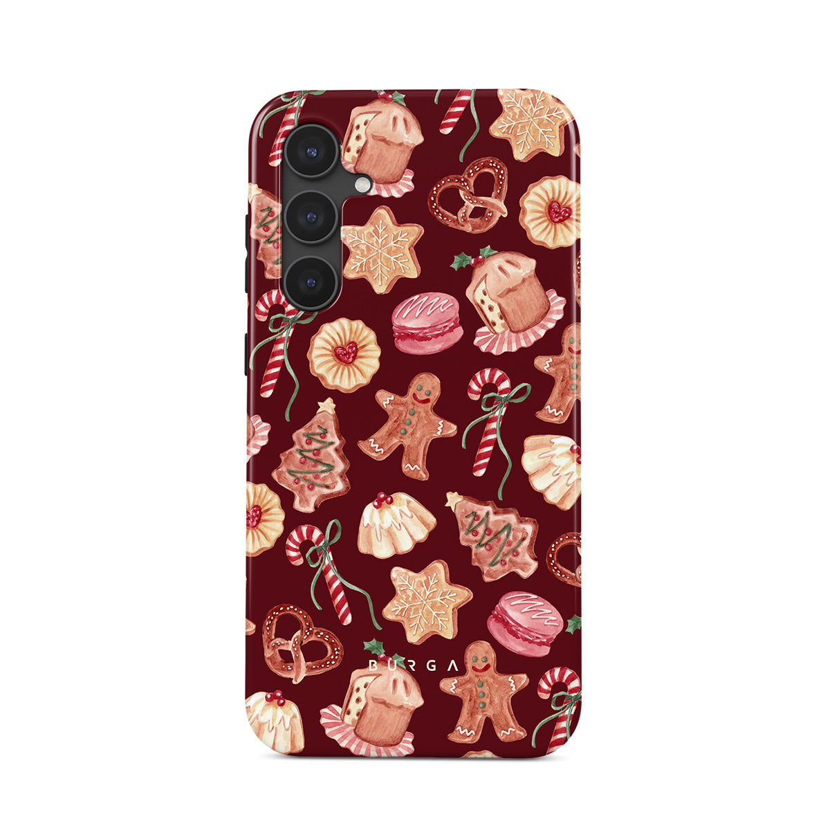 Denna design har: julsockor, pepparkaksmän, godisstänger, pepparmintgodis, festliga sötsaker, burgunderbakgrund