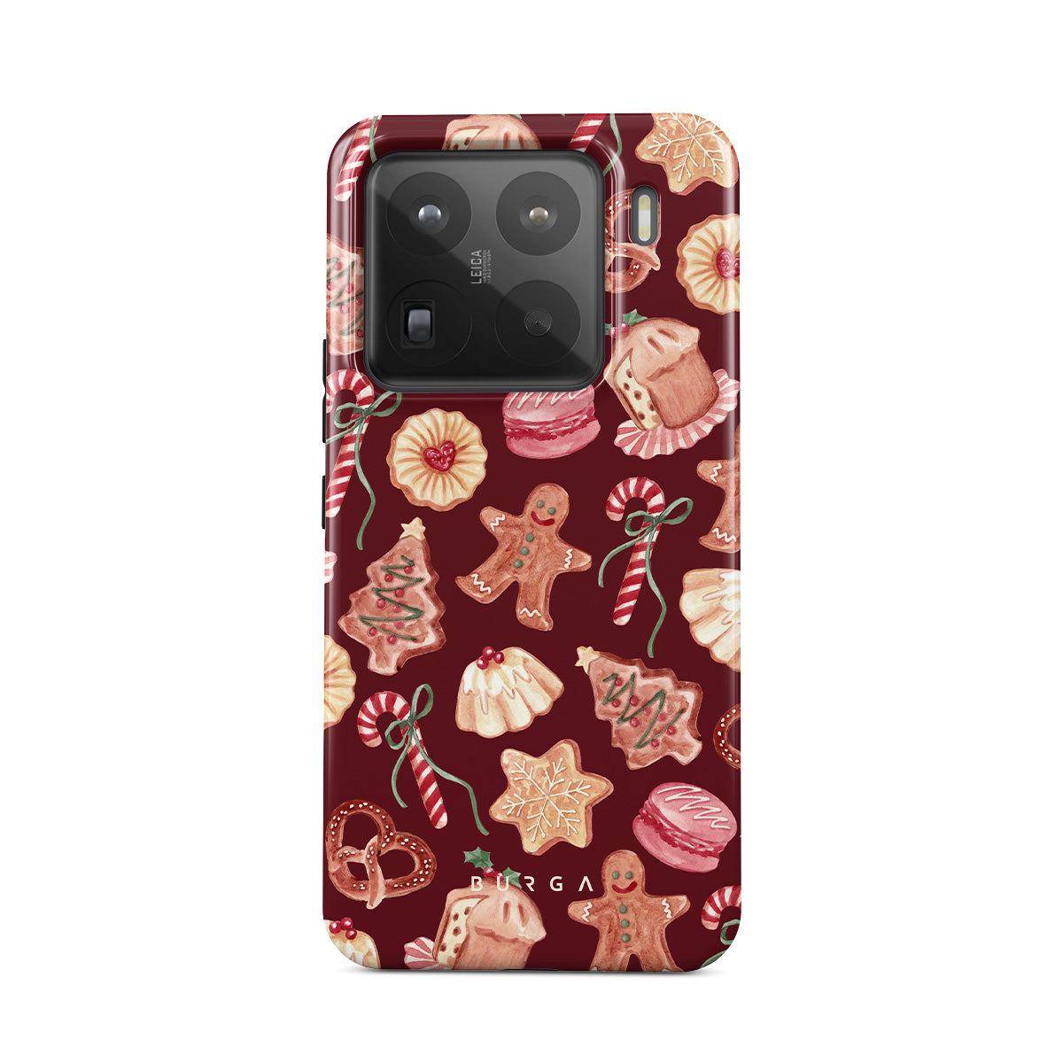 Denna design har: julsockor, pepparkaksmän, godisstänger, pepparmintgodis, festliga sötsaker, burgunderbakgrund