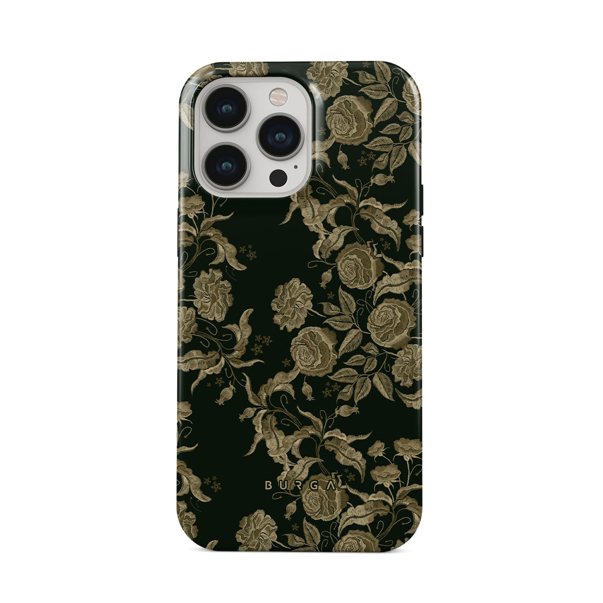 Den här designen har: vintage rosor, gyllene bladverk, djupa gröna toner.
