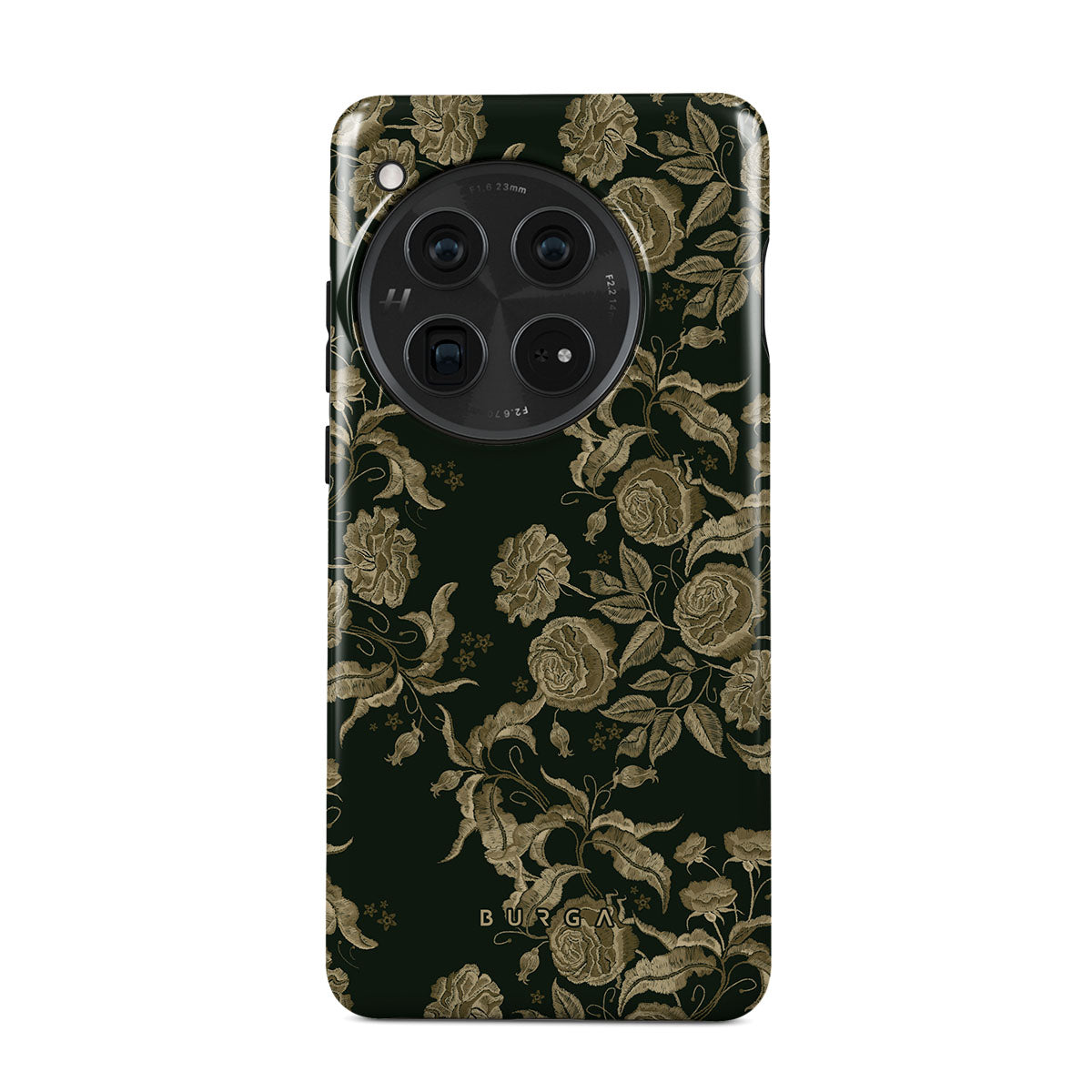 Den här designen har: vintage rosor, gyllene bladverk, djupa gröna toner.