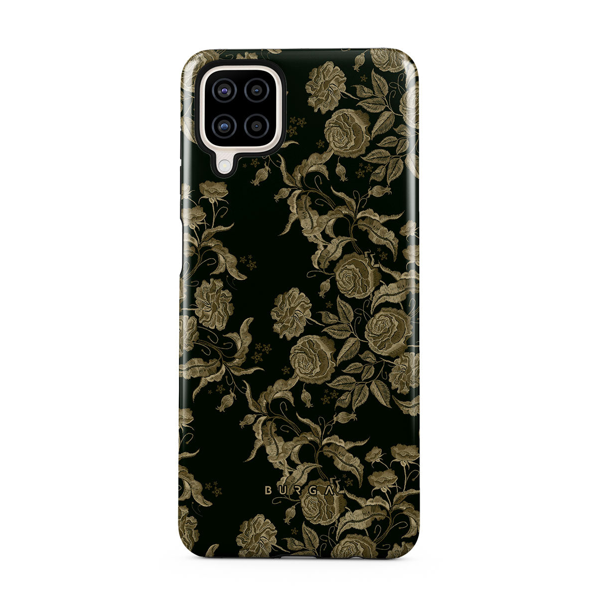 Den här designen har: vintage rosor, gyllene bladverk, djupa gröna toner.