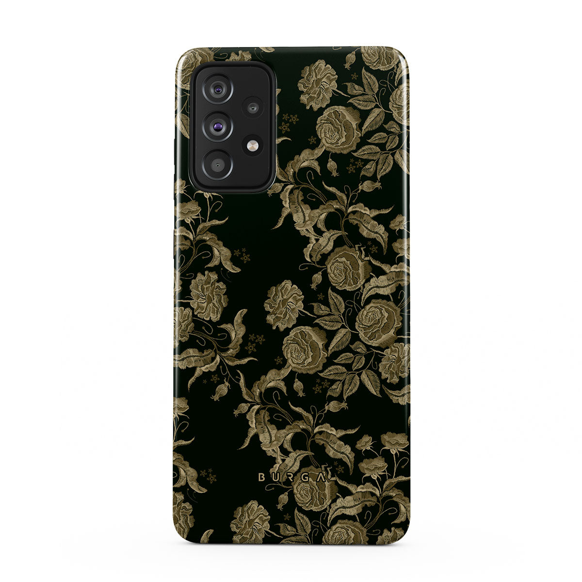 Den här designen har: vintage rosor, gyllene bladverk, djupa gröna toner.