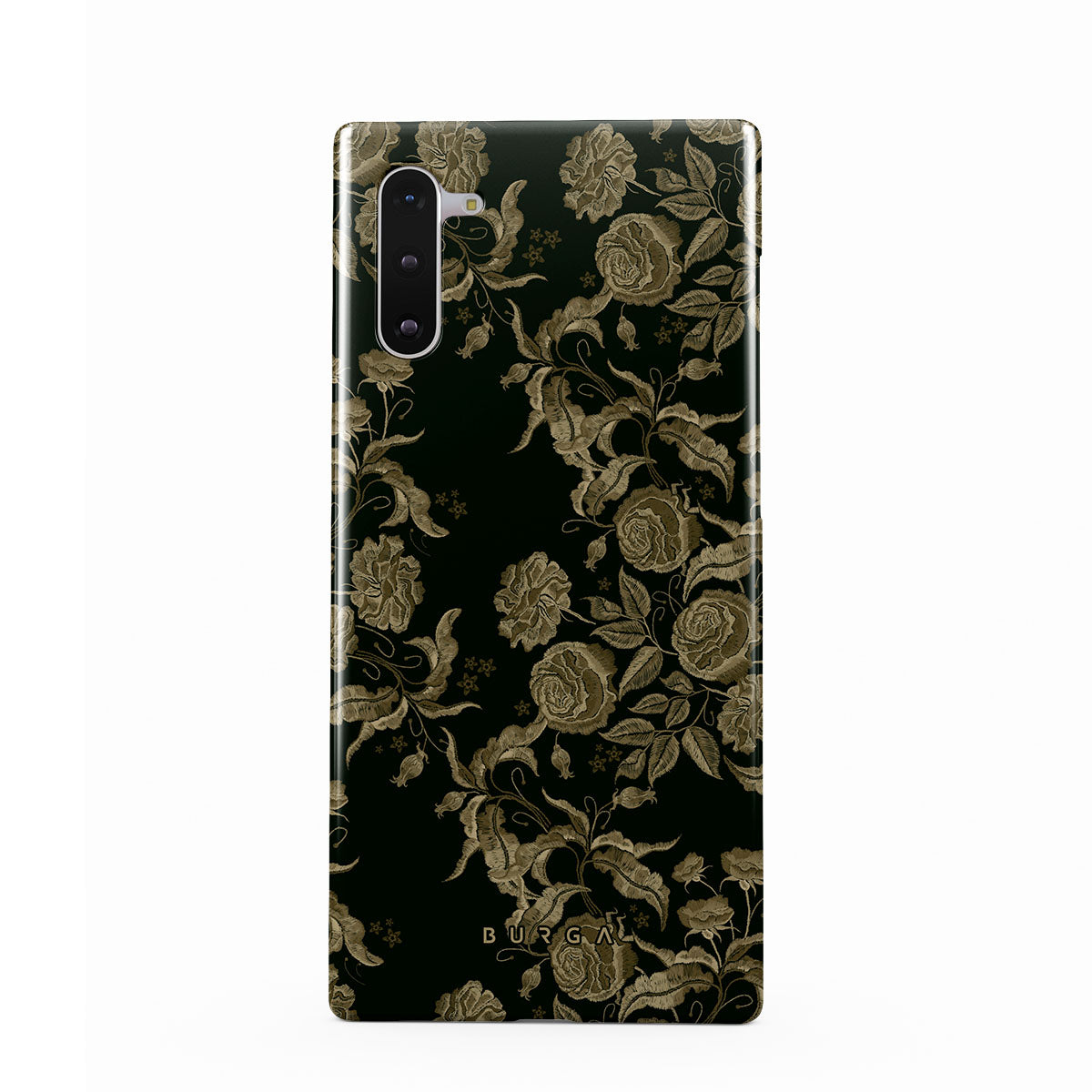 Den här designen har: vintage rosor, gyllene bladverk, djupa gröna toner.