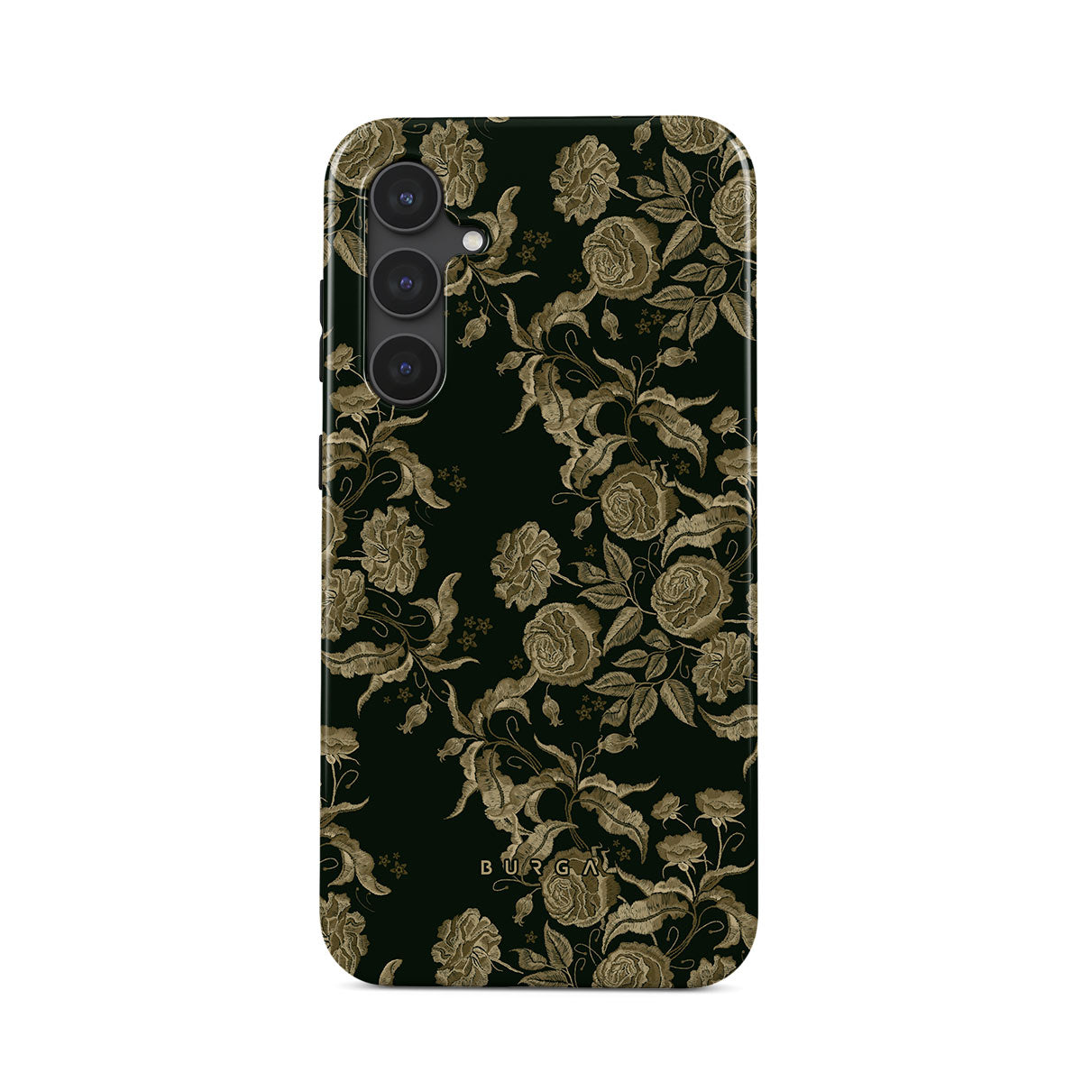 Den här designen har: vintage rosor, gyllene bladverk, djupa gröna toner.