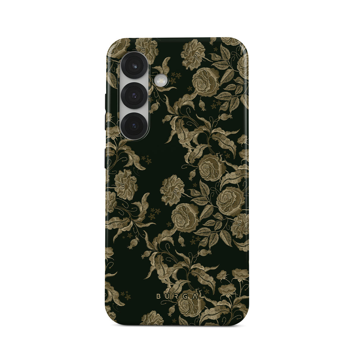 Den här designen har: vintage rosor, gyllene bladverk, djupa gröna toner.