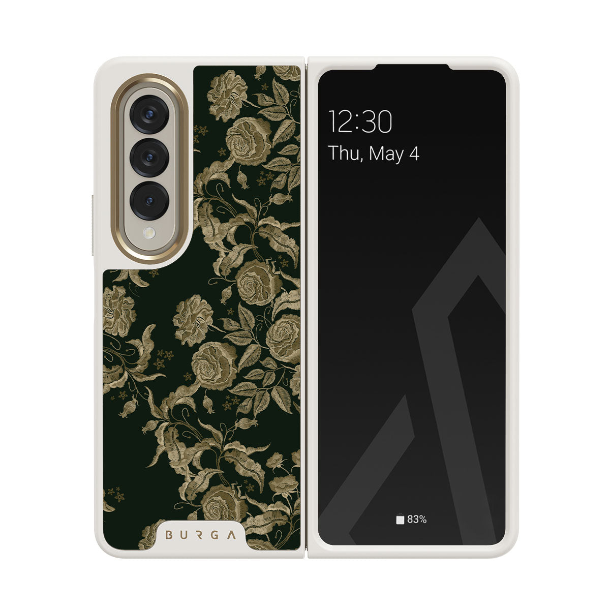 Den här designen har: vintage rosor, gyllene bladverk, djupa gröna toner.