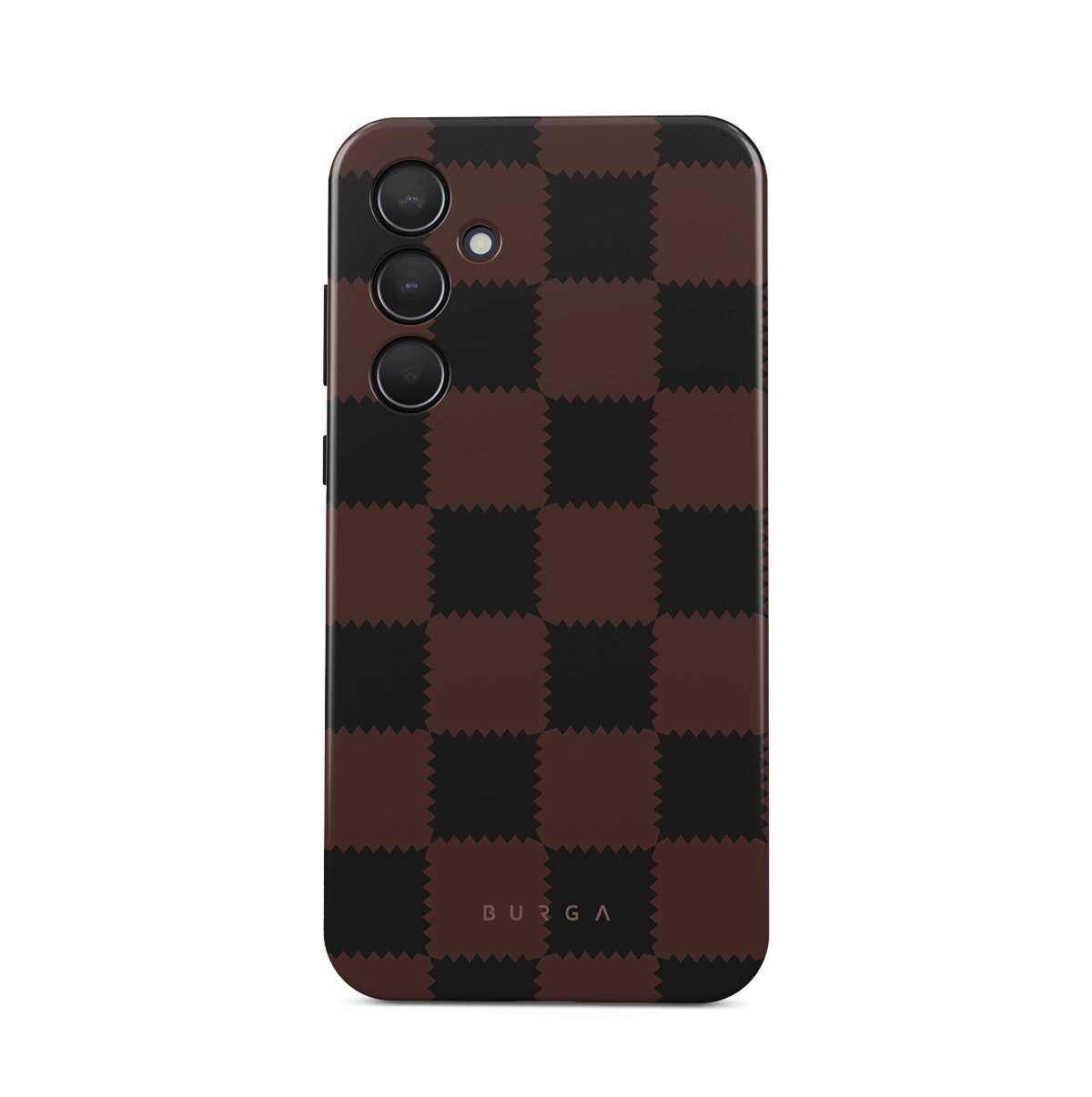 Denna design har: rutmönster, brunt och mörka toner, geometriskt