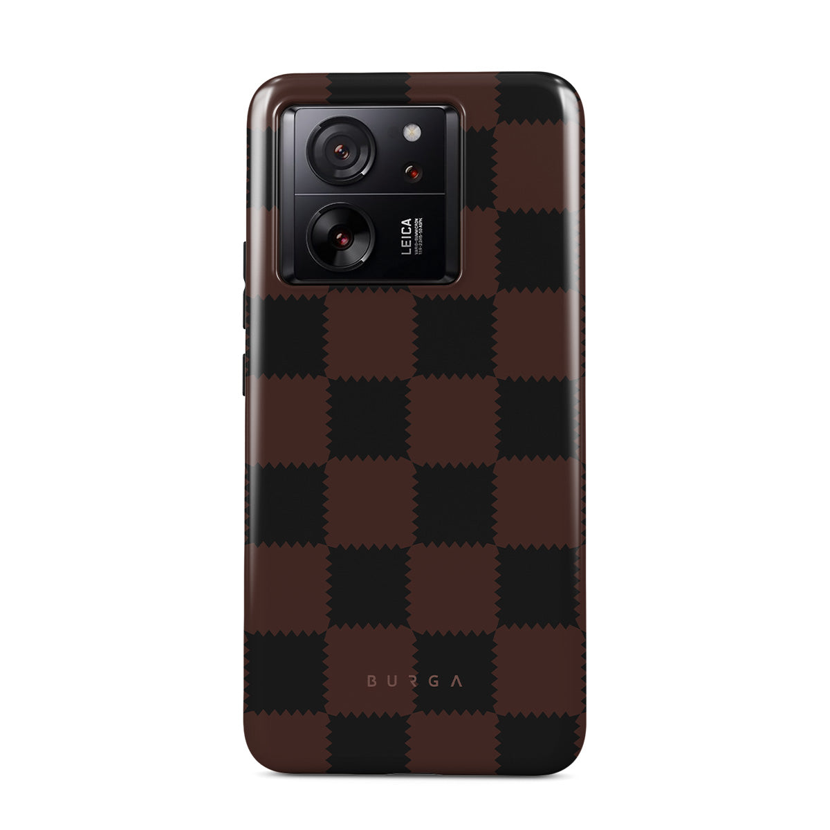 Denna design har: rutmönster, brunt och mörka toner, geometriskt