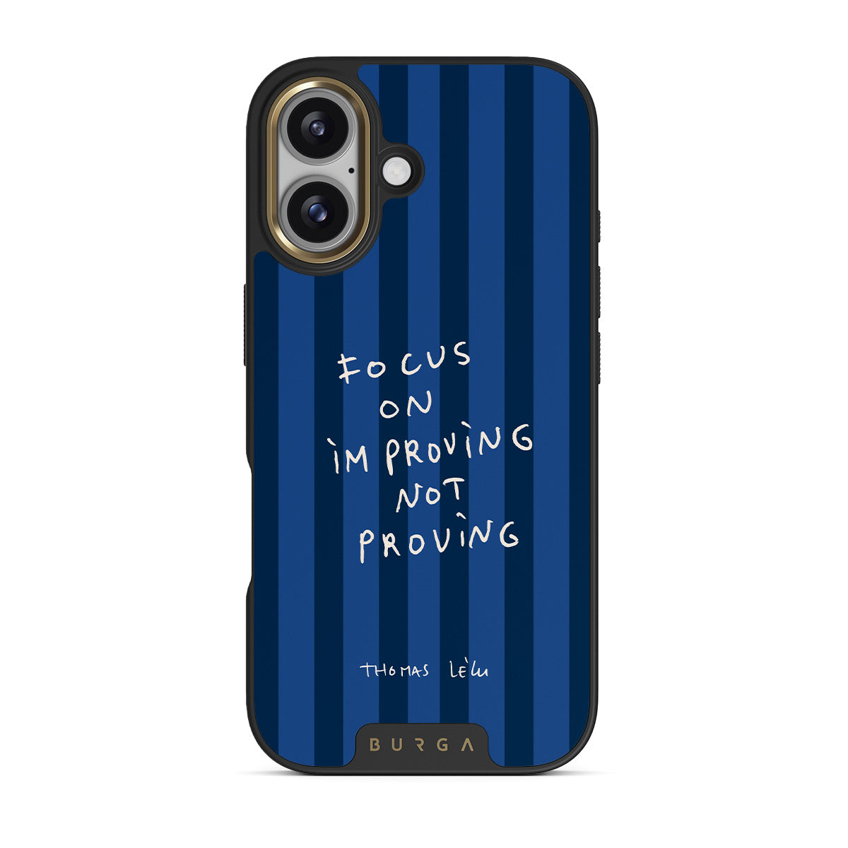 Denna design har: handskriven text, citat, blå ränder