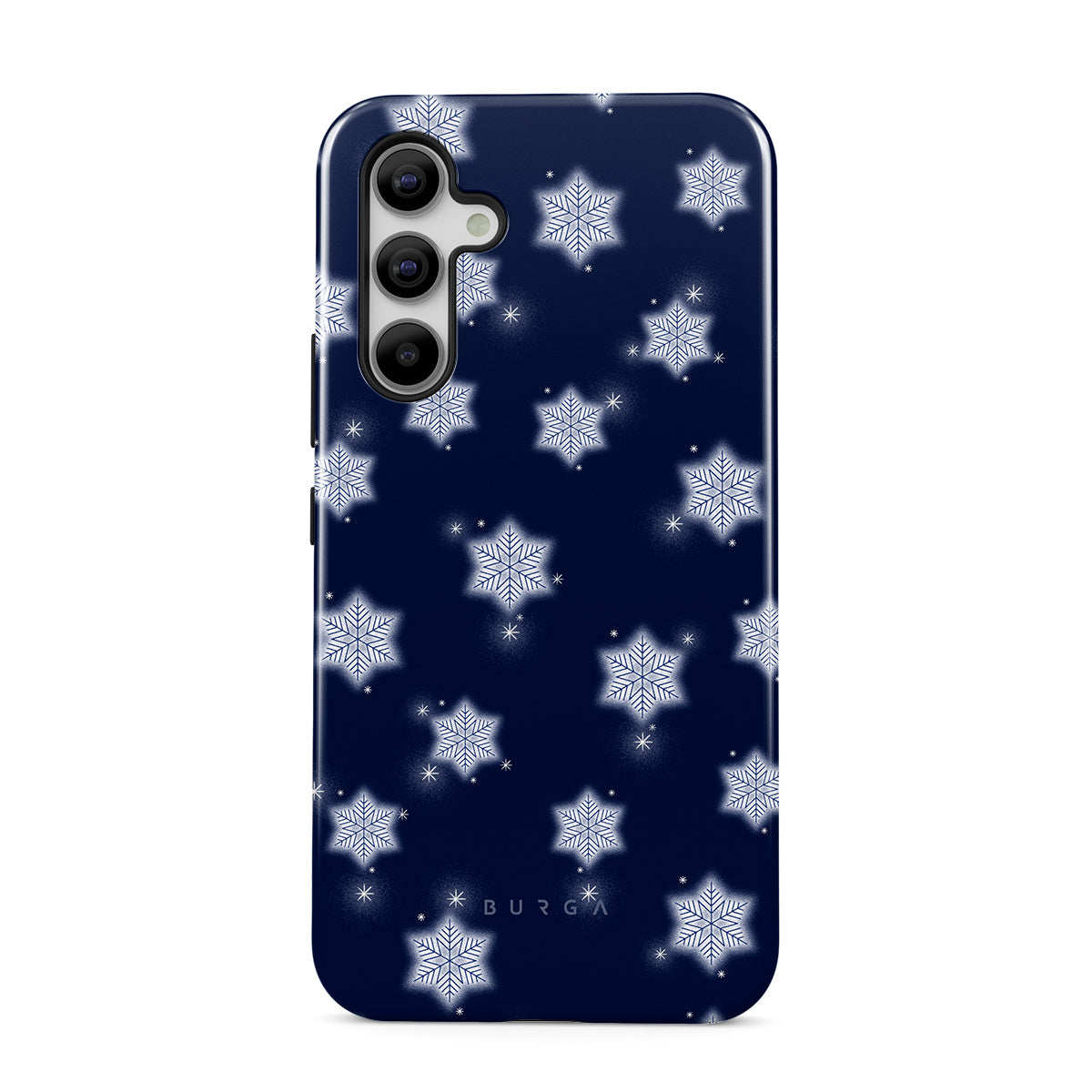Denna design har: vita snöflingor, marinblå bakgrund, vinter snöflingor mönster, geometriska snöflingor, klassisk vinterdesign