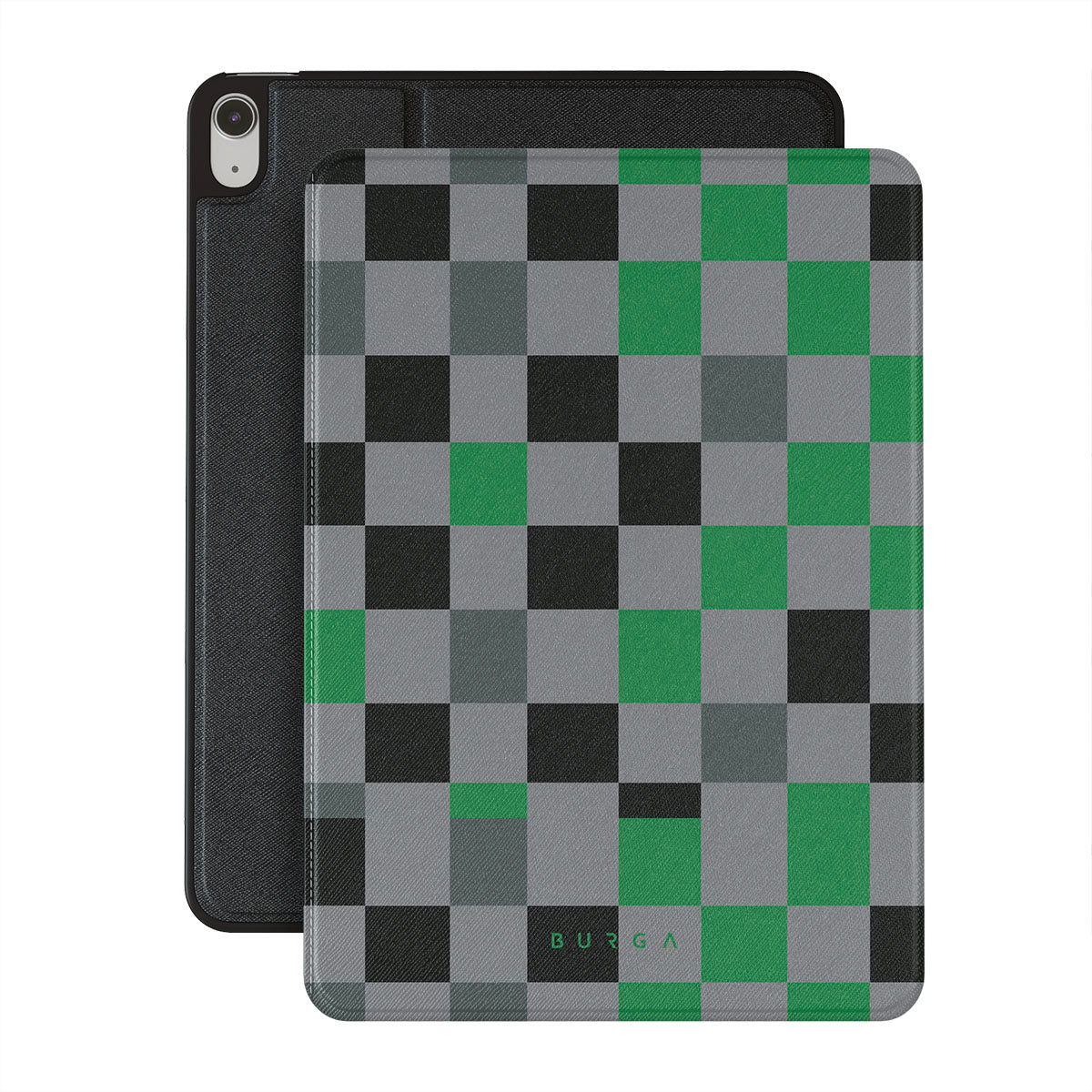 Denna design har: rutmönster, grönt, grått och svart, geometriskt