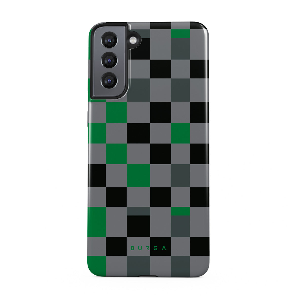 Denna design har: rutmönster, grönt, grått och svart, geometriskt