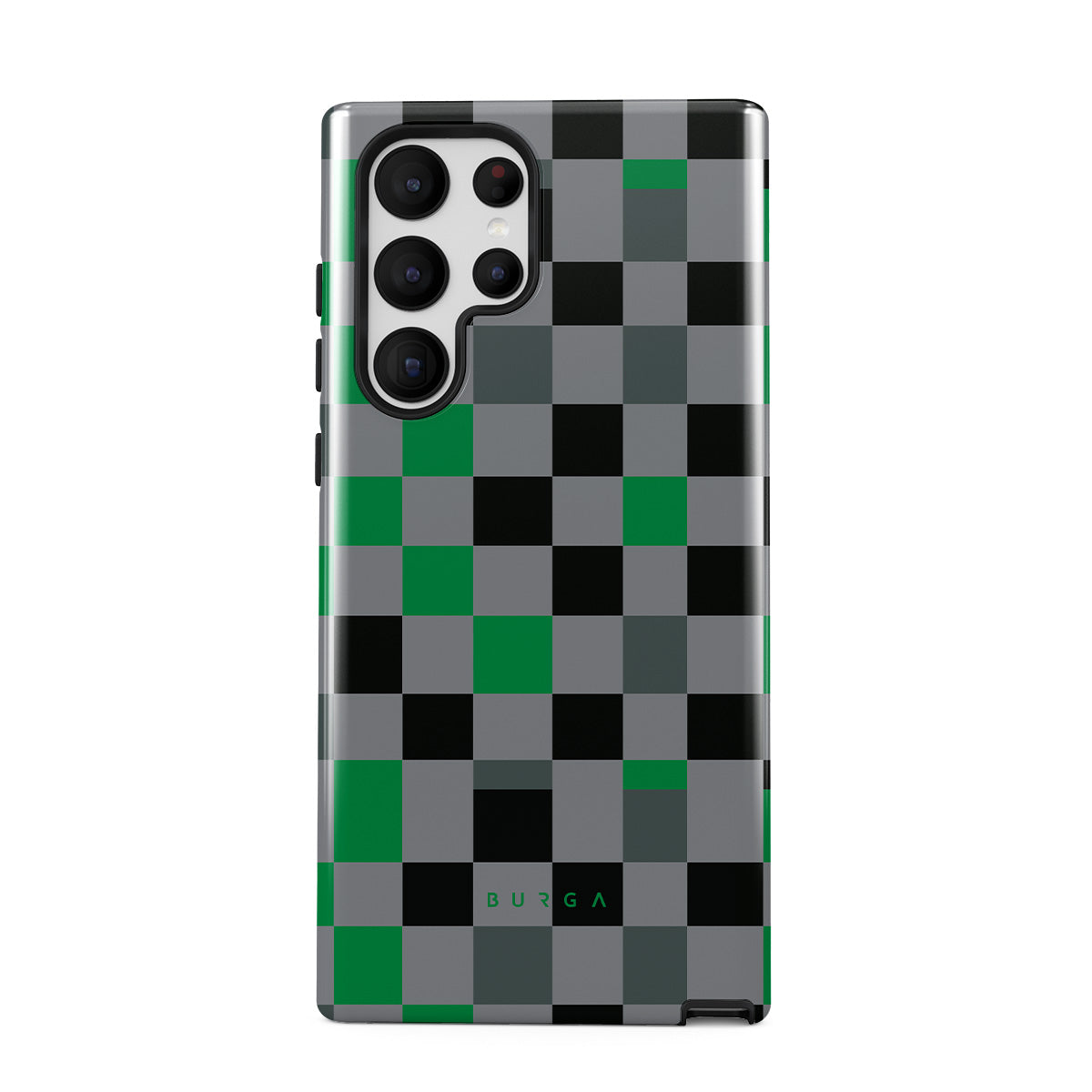 Denna design har: rutmönster, grönt, grått och svart, geometriskt