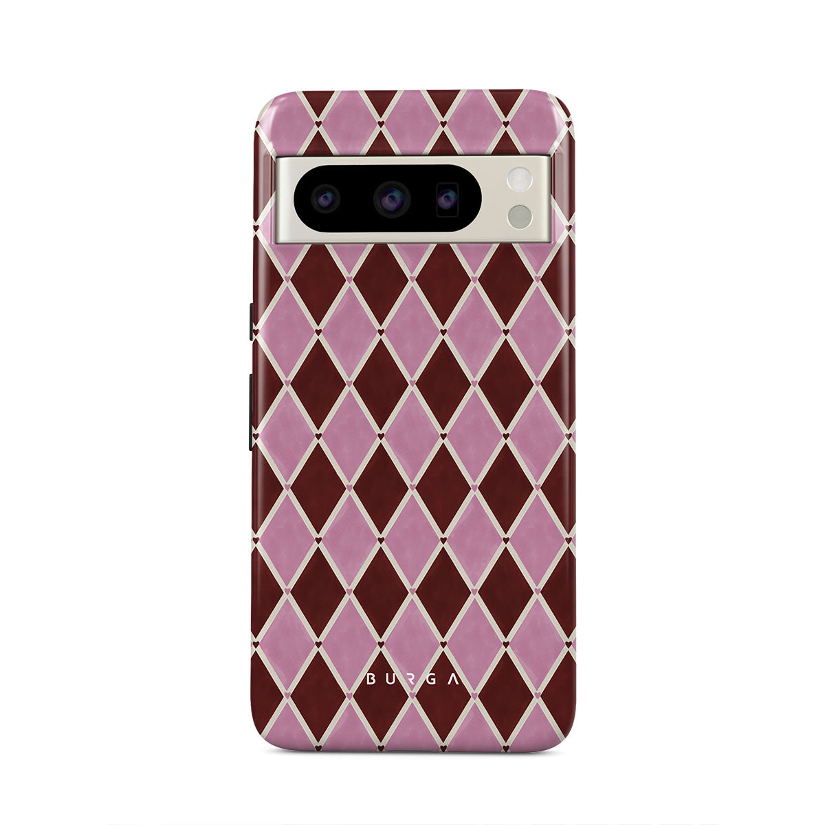 Den här stilen har: harlekinmönster, rosa diamanter, djupröd bakgrund