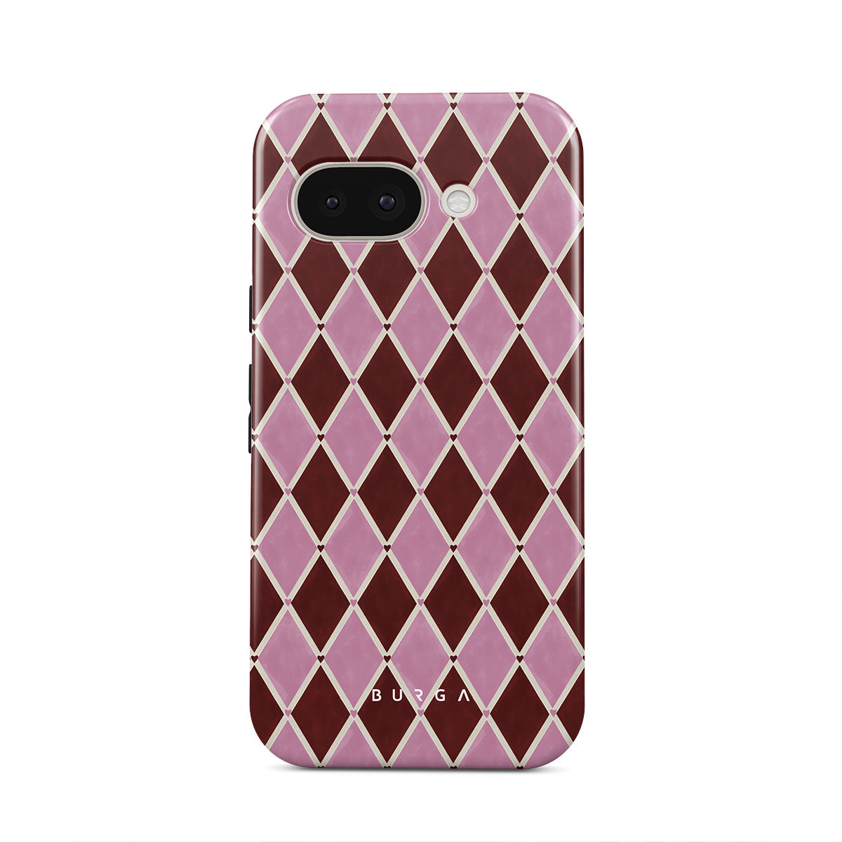 Den här stilen har: harlekinmönster, rosa diamanter, djupröd bakgrund